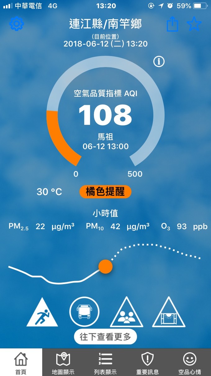 發布馬祖資訊網新聞告通知空品惡化預警 --閱讀人次 : 559 目前(6/12日13:00)空氣污染指標(AQI)已至108,為對敏感族群有影響,一般民眾如果有不適,如眼痛,咳嗽或喉嚨痛等,應該避免戶外活動。學生亦避免從事劇烈運動。