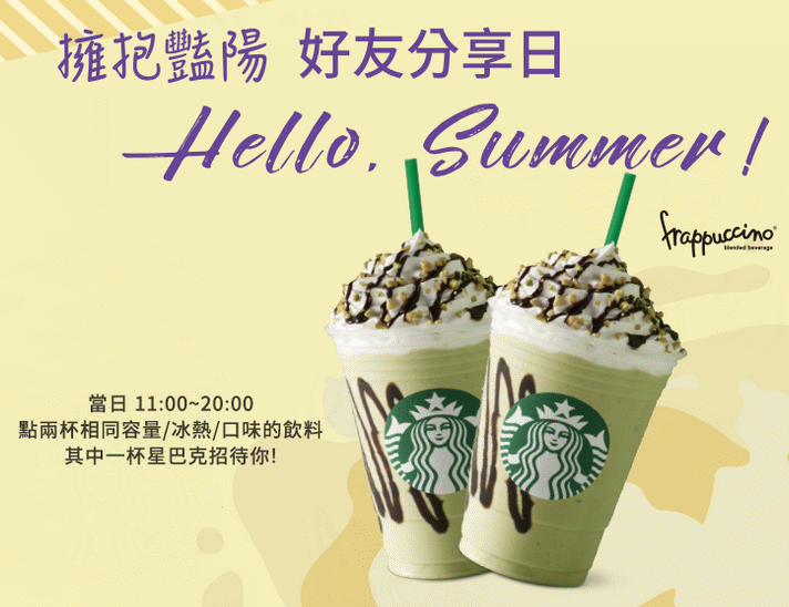 2018/6/14、 6/19、6/25、6/29活動當日11:00~20:00,全品項飲料好友分享,凡購買兩杯容量/冰熱/口味皆一致的飲料,其中一杯由星巴克招待。