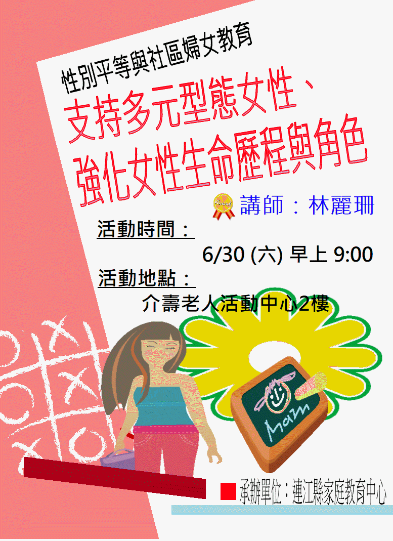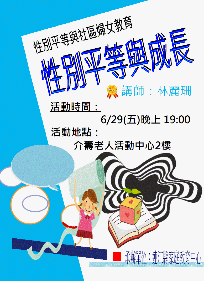 尊重人權,重視性別平等,讓你我免於性暴力!連江縣家庭教育中心辦理2場次性別平等與社區婦女講座-性別平等與成長及支持多元型態家庭女性、強化女性生命歷程與活動。2場活動分別於29日晚間7時及30日上午9時於介壽村老人活動中心2樓辦理,歡迎社區民眾踴躍參加,參加者將贈送宣導品乙份。