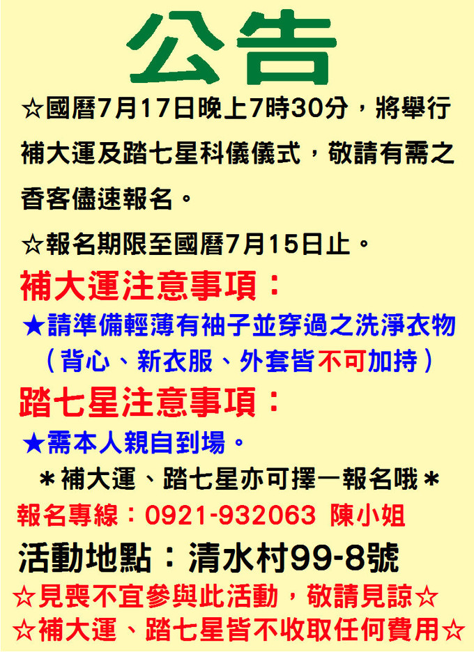★補大運:請準備輕薄有袖子並穿過之乾淨衣物。(背心、新衣服、外套皆不可加持)