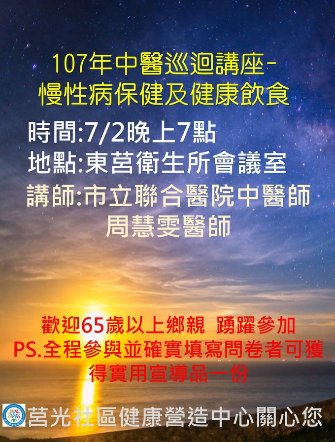 莒光社區健康營造中心7月2日(星期一)晚上7點在「東莒衛生所會議室」辦理『107年中醫巡迴講座-慢性病保健及健康飲食』講座,歡迎65歲以上鄉親踴躍參加。凡全程參加民眾贈送精美宣導品1份。