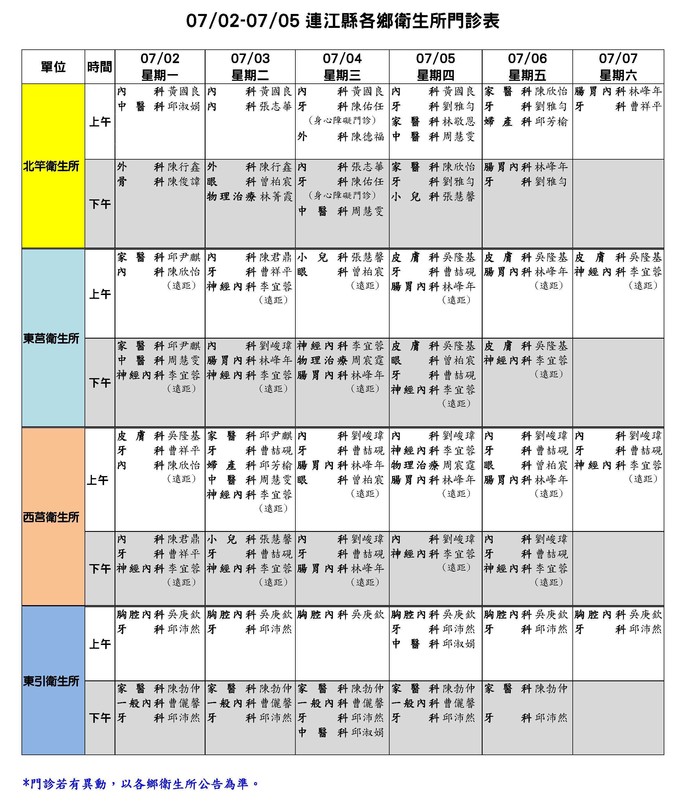 07/02-07/07連江縣各鄉衛生所門診表