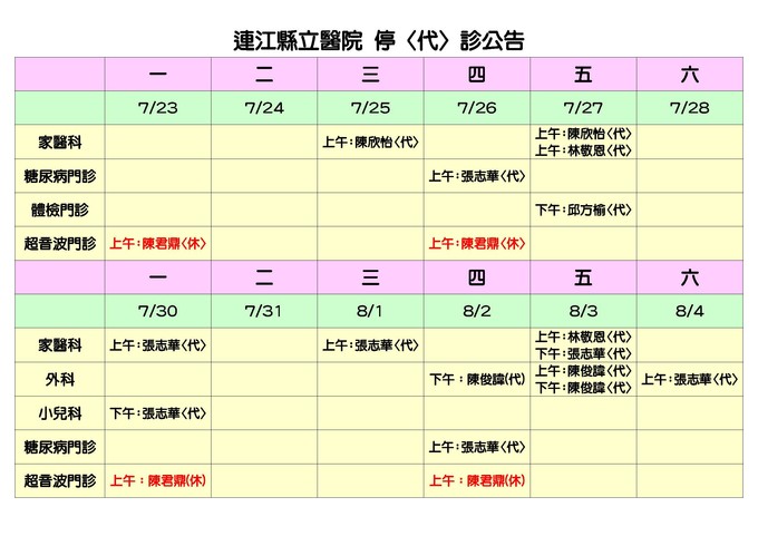 連江縣立醫院停(代)診公告