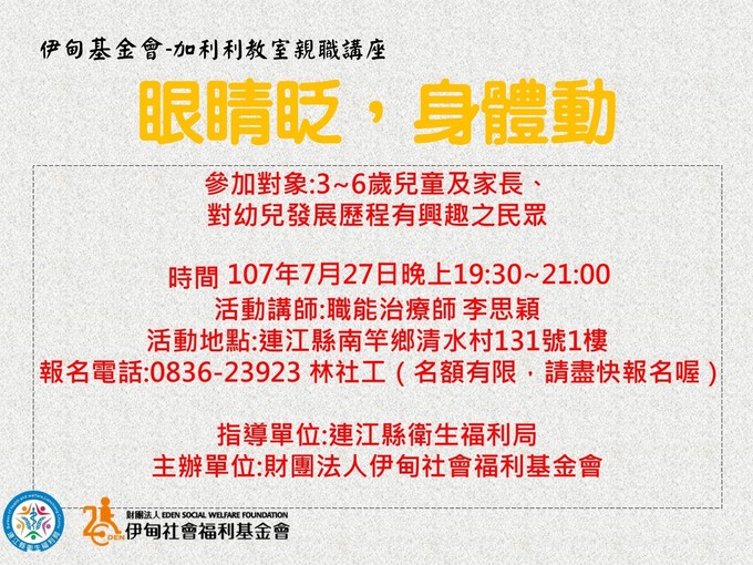 本週五晚上,在馬祖綜合福利園區有舉辦親職講座~《眼睛眨,身體動》