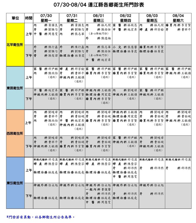 07/30-08/04連江縣各鄉衛生所門診表