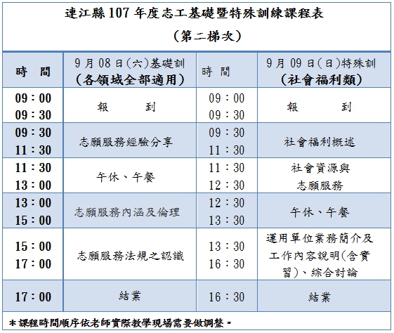 依據志願服務法規第9條規定,志願服務運用單位應對志工辦理基礎訓練及特殊訓練。志工辦理基礎、特殊訓練課程係屬運用單位之責任,惟考量各單位陸續有新志工加入,連江縣衛生福利局委託志願服務推廣中心辦理基礎訓練及社福類志工特殊教育訓練,提供各運用單位推派新進志工受訓。預訂實施日期如下: