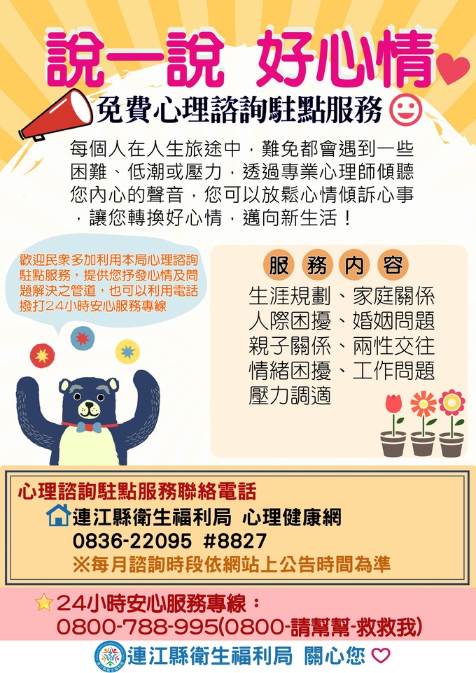 當面臨無法釐清的問題,如自我探索、生涯 發展、人際關係、情感問題、婚姻與家庭、 親職教養,或有情緒及心理上的問題時,都歡迎您來尋求心理師的協助。