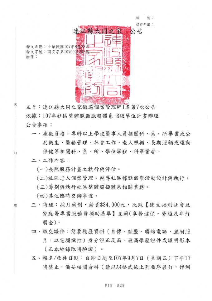 大同之家徵選個案管理師第7次公告