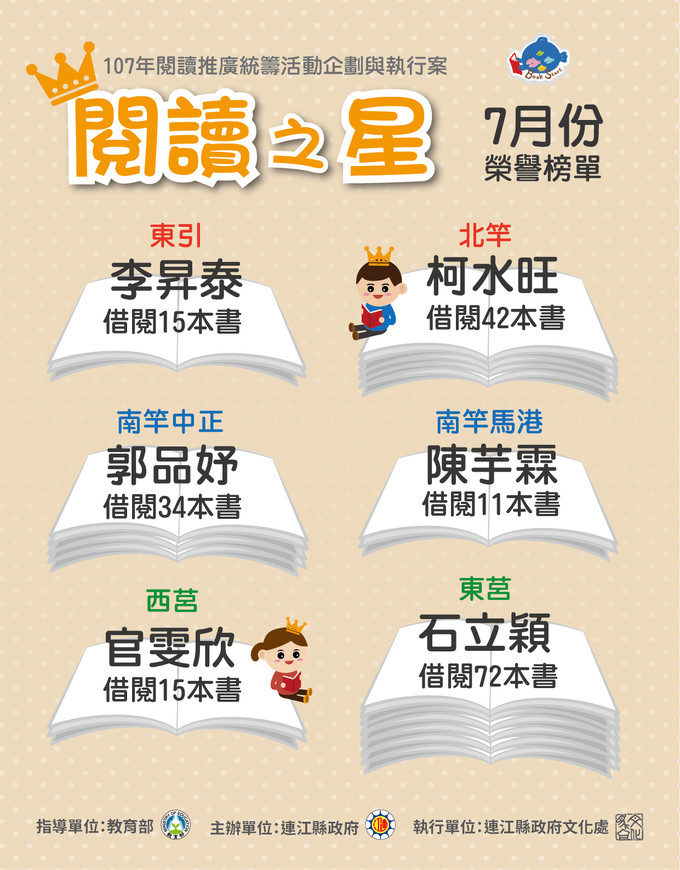 七月份「我是閱讀之星」各分館得獎名單出爐囉~! 恭喜各館得獎者