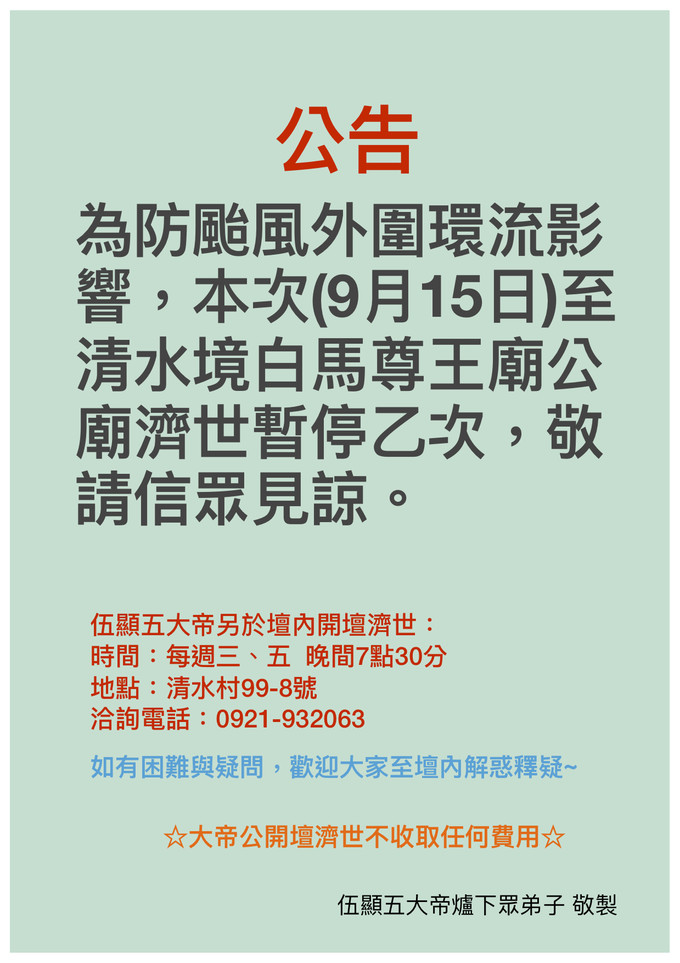 原國曆09月15日(星期六)伍顯五大帝至清水境白馬尊王廟濟世,為防颱風外圍環流影響,本次公廟濟世暫停乙次,敬請信眾見諒。