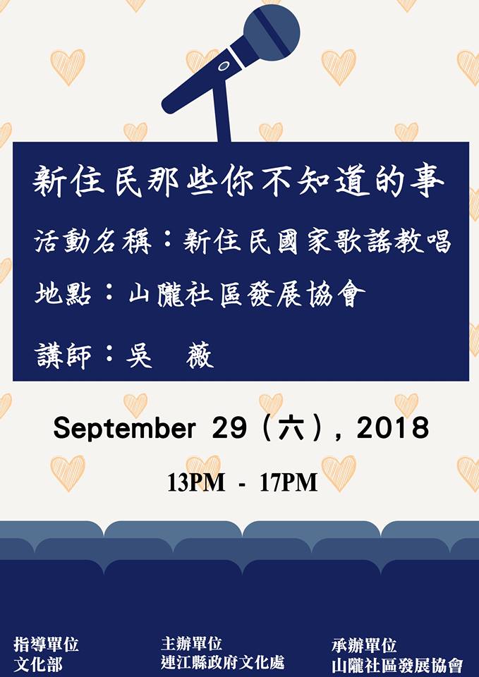 為提升新住民對自我文化的認同與自信,推展認識及尊重多元文化,讓社會大眾能更加認識外籍配偶與大陸港澳配偶的生活與特長,此次特由文化部指導,山隴社區發展協會主辦,連江縣政府文化處承辦,推出「新住民那些你不知道的事」新住民國家歌謠教唱,為地區首次舉辦的活動類型。