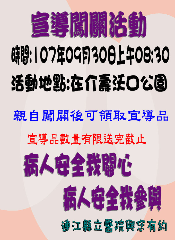 9/30病人安全宣導與健康促進闖關活動 --閱讀人次 : 1155 連江縣立醫院將於09月30日(星期日)上午8點30分假介壽沃口公園舉辦健康促進宣導活動,選定民眾最切身相關的議題進行宣導,包括「老人防跌」、「用藥安全」、「遠離三高及代謝徵候群」、「癌症篩檢」、「洗手」、「戒菸七巧」等宣導,藉此希望能全面性的進行對社會大眾宣導促進病人安全與身心健康的知識和方法。每位參加鄉親需親自通過各關卡簽章後(一人限領一張),可領到一份參加獎(參加獎數量有限送完為止),邀請大家一起來加入守護健康的行列。