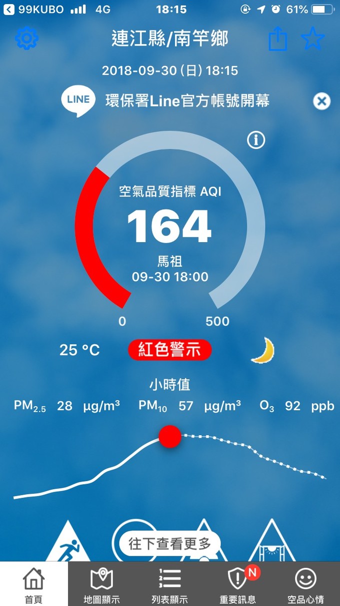 AQI指標達對所有族群影響 (預警階段) --閱讀人次 : 678 目前(9/30日18:20)空氣污染指標(AQI)已至164,對所有人的健康開始產生影響,對於敏感族群可能產生較嚴重的健康影響,主要污染物為臭氧,啟動空氣品質不良預警通報機制,透過電子新聞及 Line 群組進行通報,提醒相關單位進行預警並注意;一般民眾則建議減少非必要之戶外活動、健康敏感族群應戴上口罩預防;學校則加強宣導配戴口罩等防護工具、適度關閉門窗、避免長時間在戶外逗留等。( https://taqm.epa.gov.tw/taqm/tw/AqiMap.aspx)