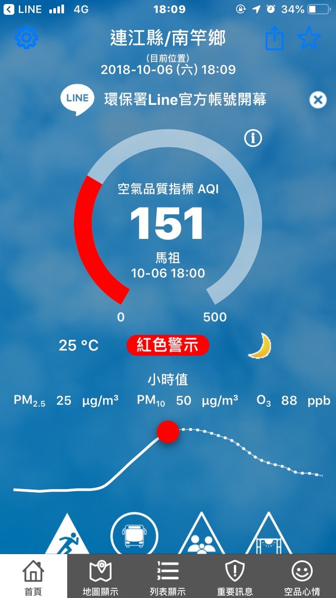 6日 AQI指標已達對所有族群有影響 --閱讀人次 : 506 目前(10/06日18:00)空氣污染指標(AQI)已至151,為對敏感族群不健康,一般民眾如果有不適,如眼痛,咳嗽或喉嚨痛等,應該避免戶外活動。學生亦避免從事劇烈運動。