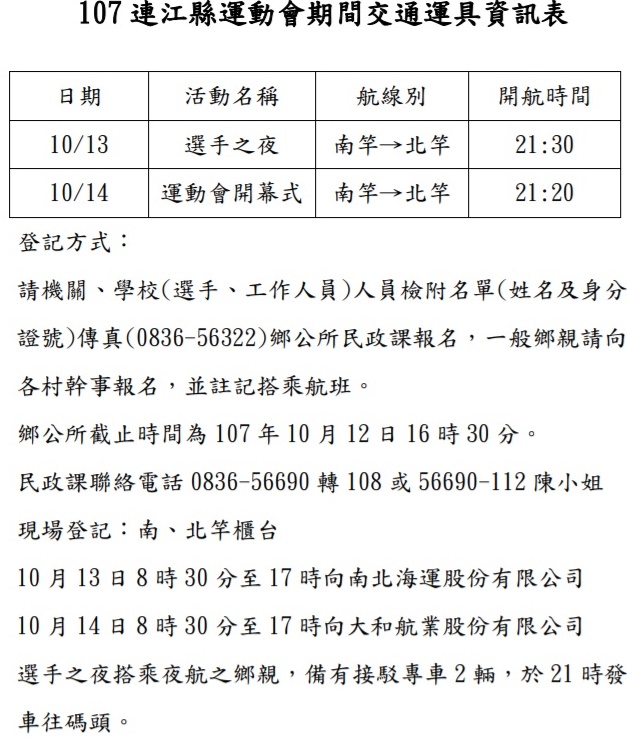 選手之夜及開幕式均安排有夜航船舶由南竿往北竿,請欲搭乘之鄉親盡速於時間內向北竿鄉公所及船公司報名。