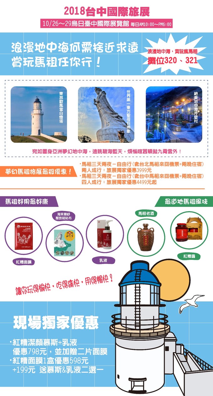 10/26~10/29 ,2018台中國際旅展AM10:00~PM6:00 烏日臺中國際展覽館「浪漫地中海,賞玩瘋馬祖」320、321攤位,讓你賺翻、玩翻、嗨翻年末假期!