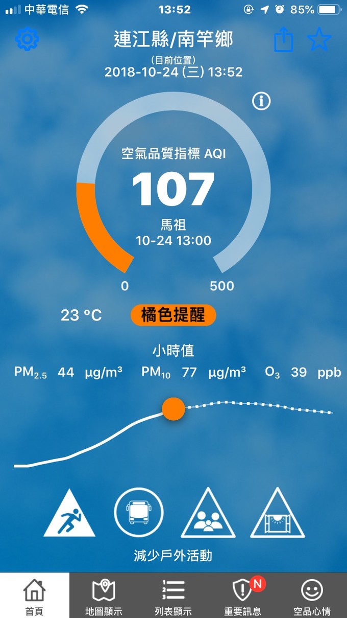 AQI指標已達對所有族群有影響 --閱讀人次 : 526 目前(10/24日13:54)空氣污染指標(AQI)已至107,為對敏感族群不健康,一般民眾如果有不適,如眼痛,咳嗽或喉嚨痛等,應該避免戶外活動。學生亦避免從事劇烈運動。