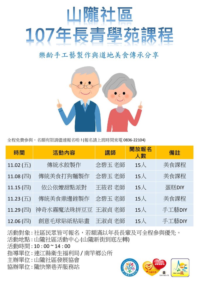 山隴長青學苑 - 樂齡手工藝與廚藝分享 --閱讀人次 : 1283 報名電話:0836-22104 (隴快樂巷弄服務站,名額有限,請上班時間來電報名)