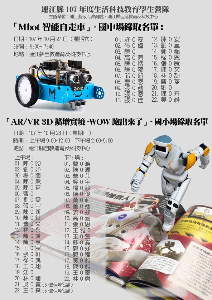 感謝各位家長對生活科技營隊的支持,報名人數都已統計完畢,場次及錄取名單詳見海報。由於國小場次報名人數高達60人,雖然請學校抽籤篩選,但是仍有接到未入選學生很想參加的心聲,因此中心決定加開一場。本週錄取的同學, 請依照上課時間到連江縣自造教育與科技中心(中正國中小)報到,並請自帶喝水用水杯。