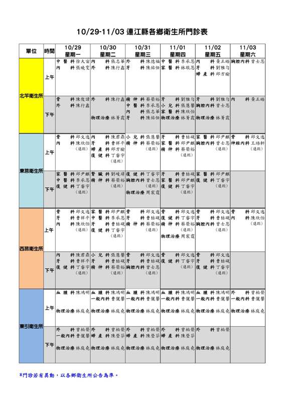 10/29-11/03連江縣各鄉衛生所門診表