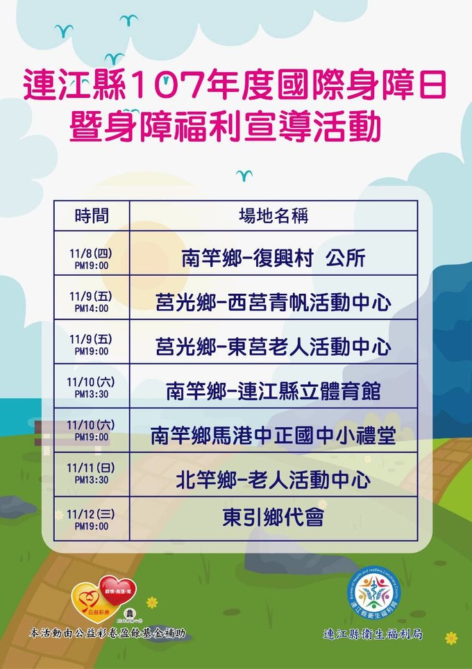 由連江縣衛生福利局辦理的「107年度國際身障日暨身障福利宣導活動」,將於107.10.7-12日於四鄕五島舉辦。內容包含身障福利宣導,相關法律知識等,健康講座,影片賞析等等...並有闖關遊戲,有奬徴答,及活動宣導品,先來先領送完為止。歡迎鄉親到場共襄盛舉!