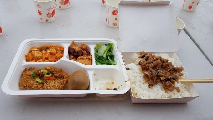 5菜+1個滷蛋便當,志工們,辛苦了!馬拉松賽事一早至下午1時結束,中餐就在各工作崗位解決。為了一致化,中餐便當集中包給大餐廳調製,也比較快速,避免過去分散及遺漏。