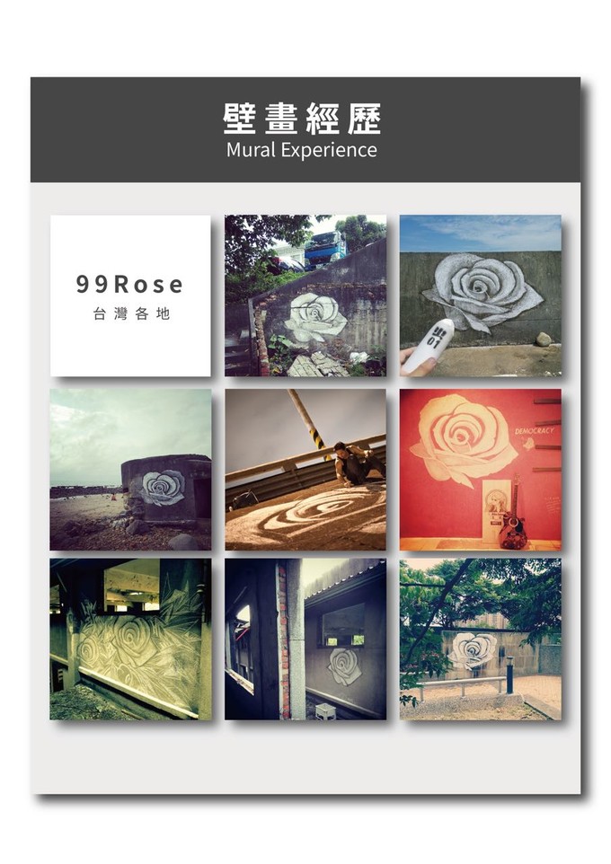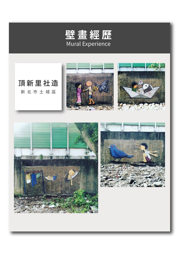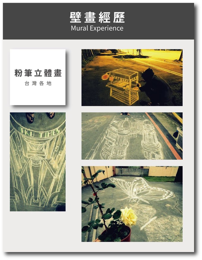 專長于粉筆立體設計、街頭塗鴉、插畫設計、廢棄物改造、平面設計、服裝噴製。
