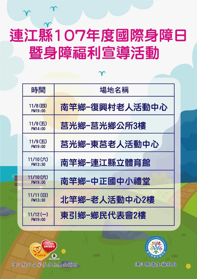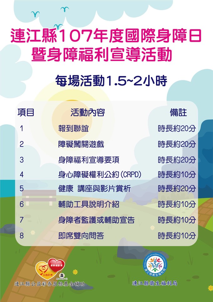 今天晚上19:00復興村老人活動中心舉辦連江縣107年度國際身障日暨身障福利宣導活動