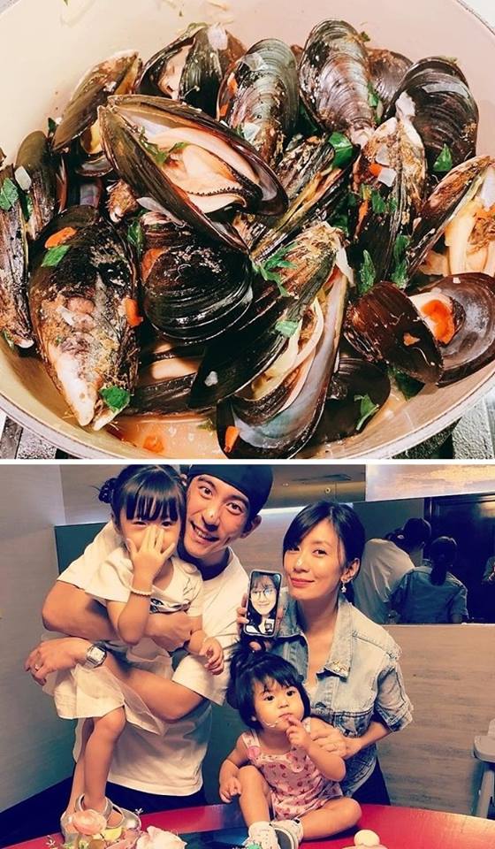上圖:演員修杰楷(女星賈靜雯老公)17日烹調白酒淡菜貼在臉書、微博,引起注目。下圖:修杰楷、賈靜雯夫婦與可愛2位女兒咘咘、Bo妞。(圖:修杰楷臉書)