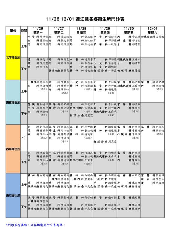 11/26-12/01連江縣各鄉衛生所門診表