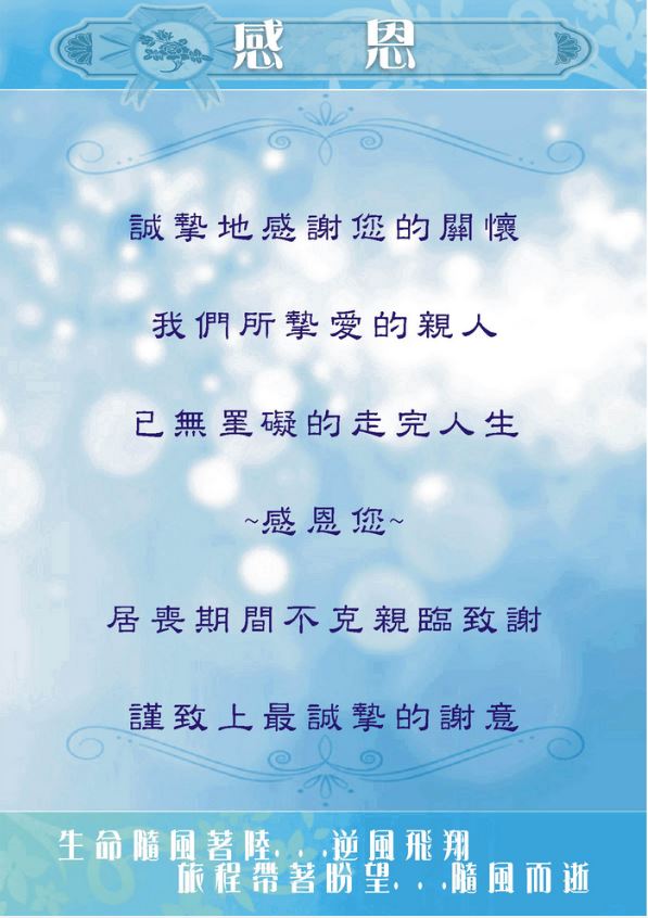 父親生平簡樸,行事低調。故於馬資網隨附電子訃聞,謹告諸親朋好友。