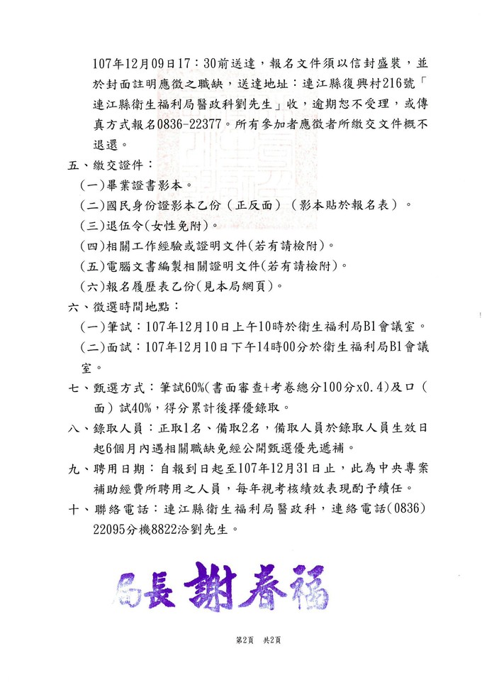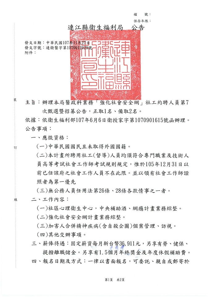 連江縣衛福局-招募社安網社工人員1名