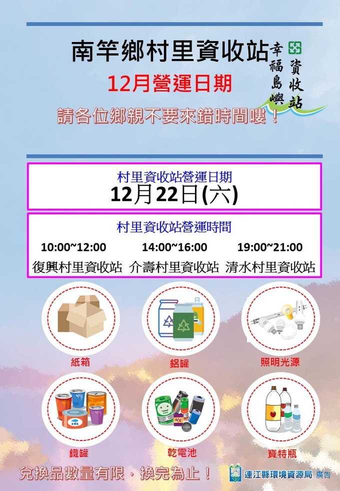 南竿鄉幸福島嶼資收站107年12月22日(六)正常營運,