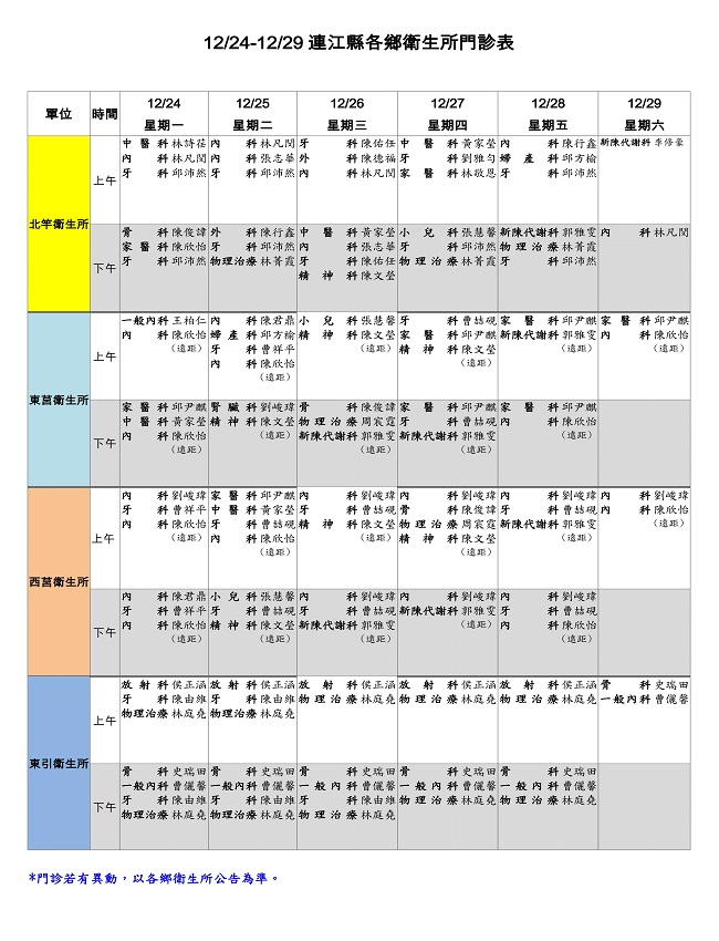 12/24-12/29連江縣各鄉衛生所門診表