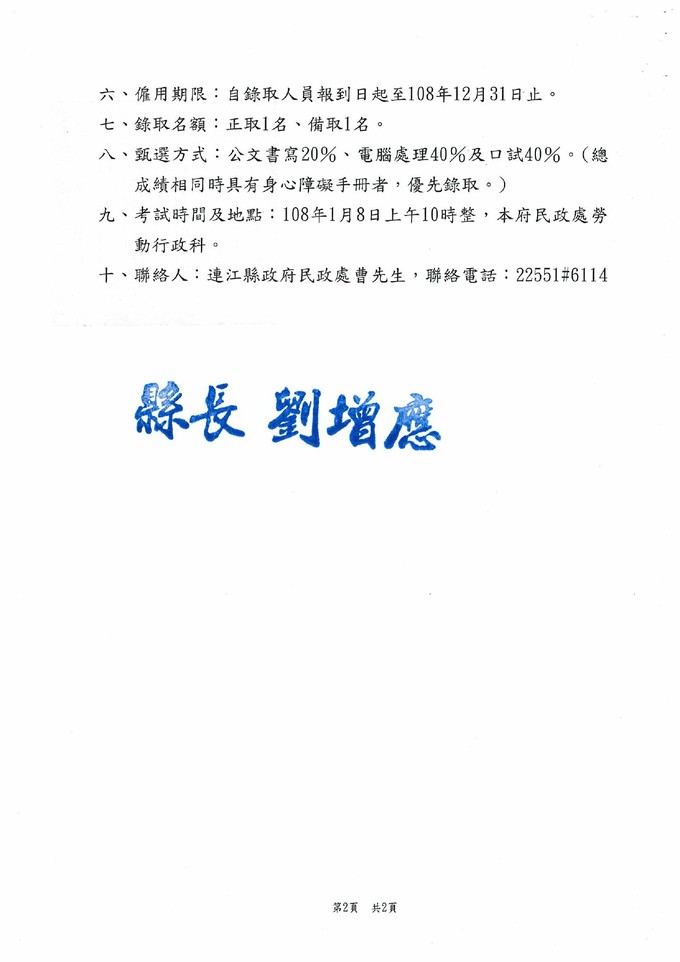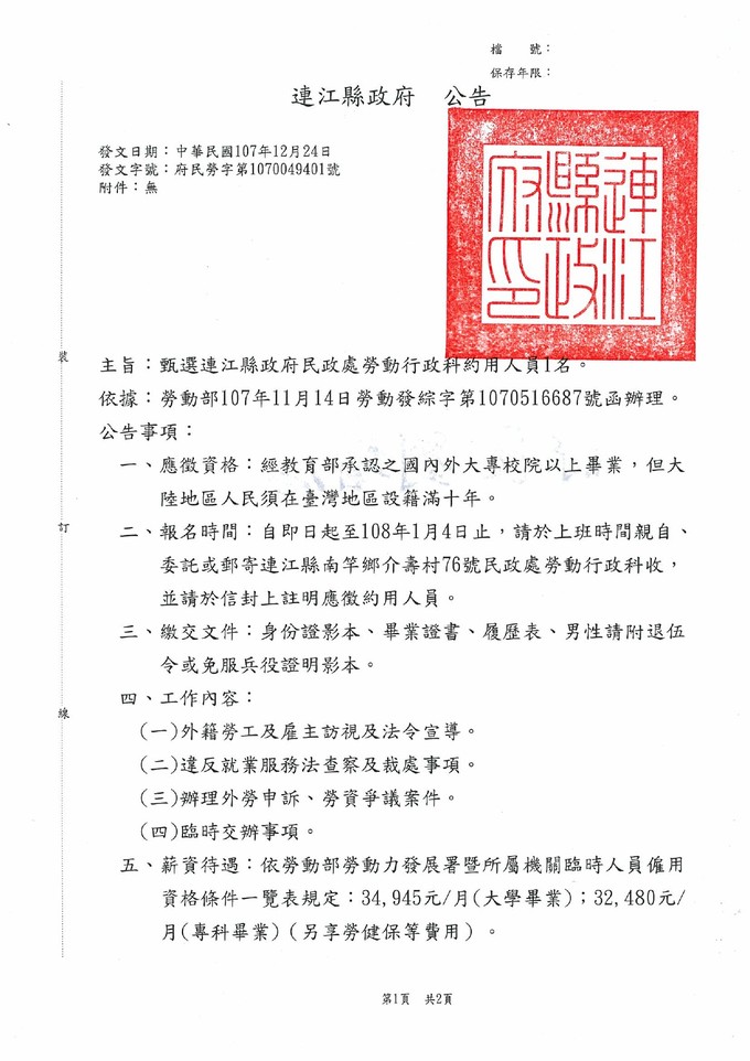甄選連江縣政府民政處約用人員1名