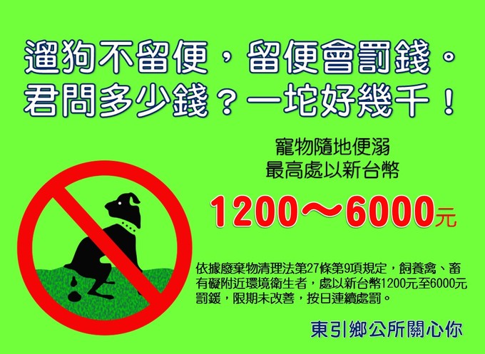 為維護村莊清潔衛生,請家中飼養寵物的鄉親,不要讓愛犬隨處大小便。如有被舉報蒐證者,本所將依廢棄物清理法罰款1200元~6000元。