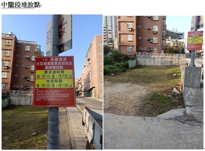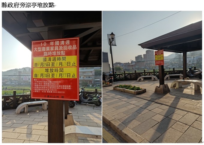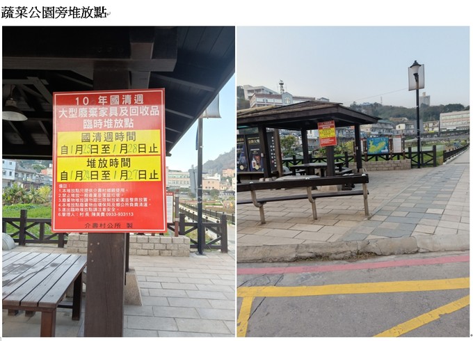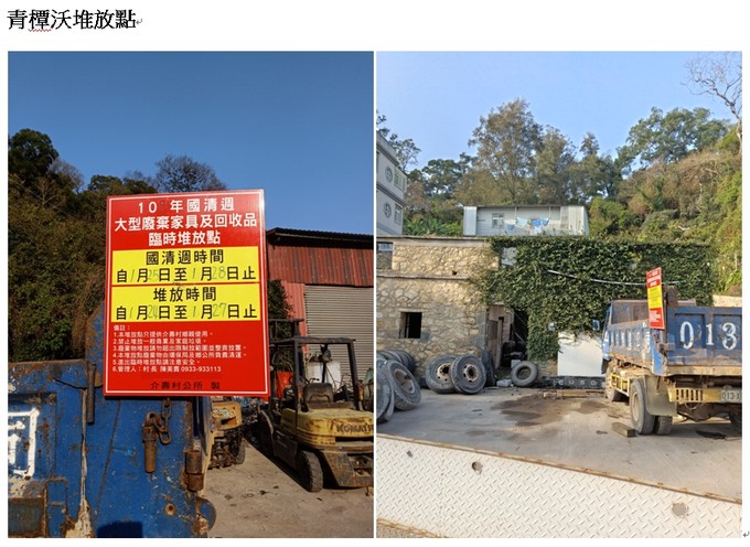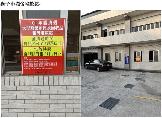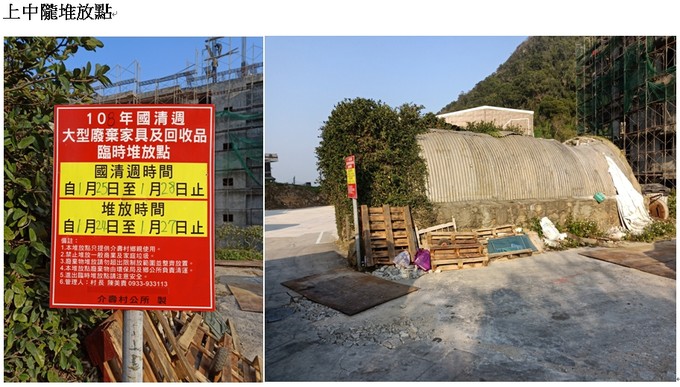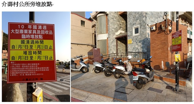 介壽村各區域大型廢棄傢具及回收物臨時堆放點,請各家戶鄉親多加利用,如有需要村長協助請撥電話0933933113。謝謝