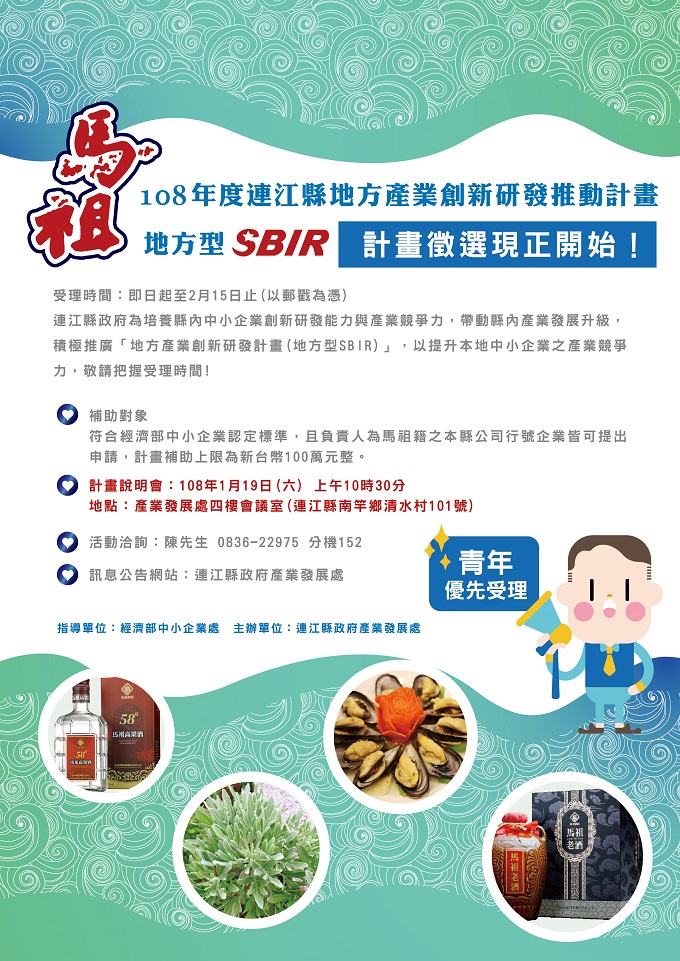 108年連江縣地方型SBIR申請書範本、撰寫說明附件表單歡迎下載利用,第一階段收件時間至108年2月15日。