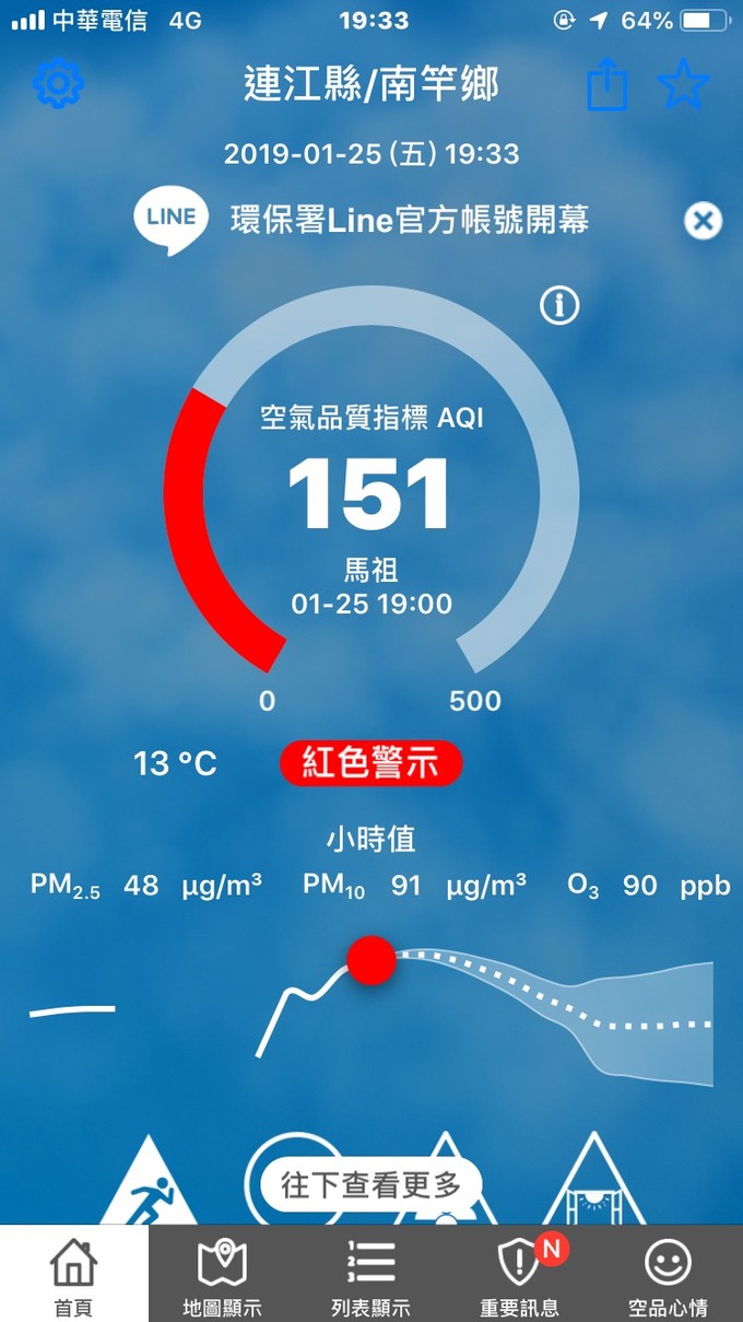 依據環保署今日(1月25日)下午19:36空氣品質監測結果,馬祖地區受境外污染物影響,空氣品質指標AQI為151,對所有族群不健康,環境資源局提醒您,