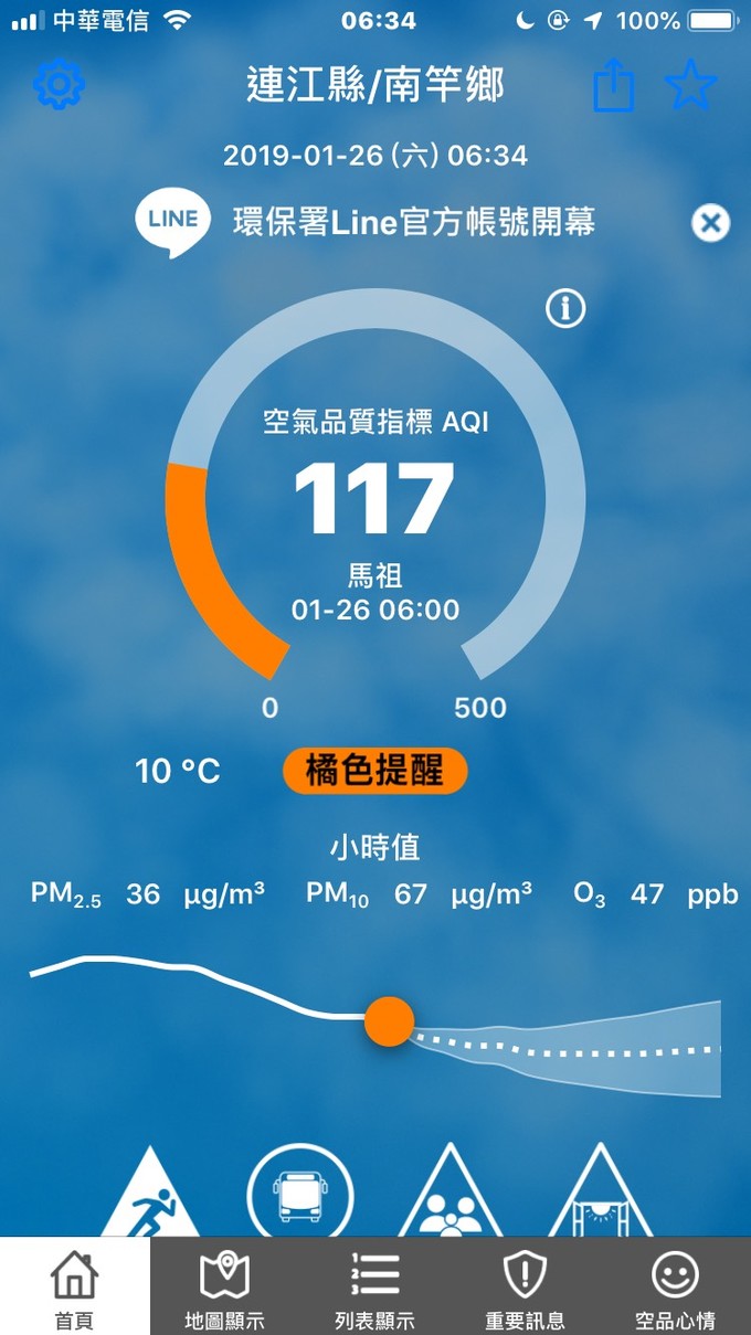 依據環保署今日(1月26日)上午06:38空氣品質監測結果,馬祖地區受境外污染物影響,空氣品質指標AQI為117,對敏感族群不健康,環境資源局提醒您,