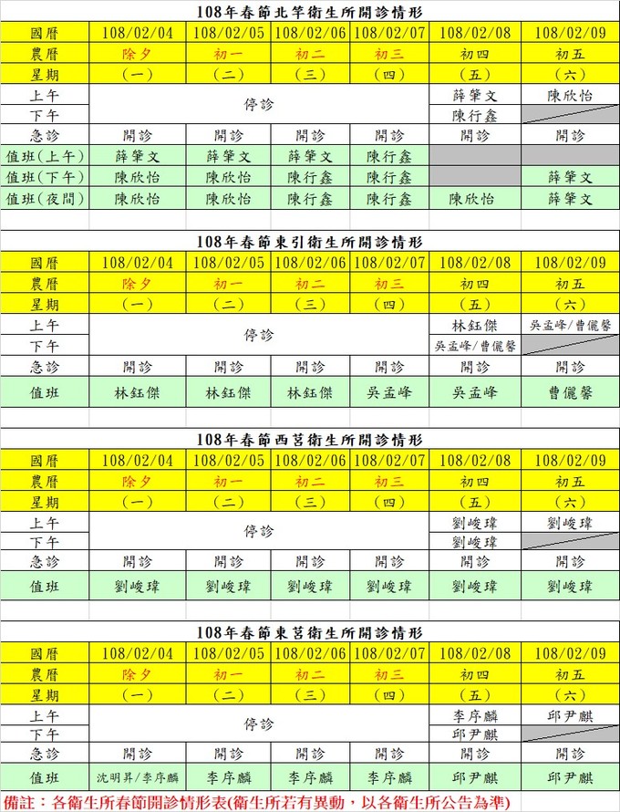 各衛生所春節值班表
