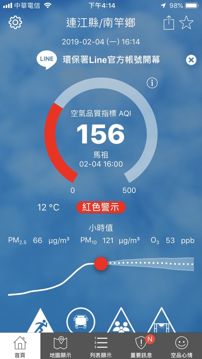 依據環保署今日(2月4日)下午16時空氣品質監測結果,馬祖地區受境外污染物影響,空氣品質指標AQI為156,對所有族群不健康,環境資源局提醒您