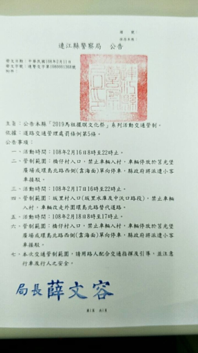 2019馬祖擺暝文化祭系列活動交通管制 --閱讀人次 : 1312 公告事項: