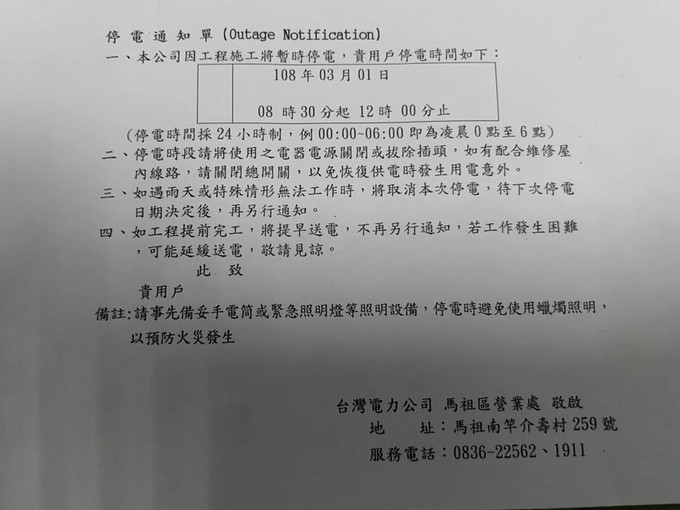 台灣電力股份有限公司馬祖區營業處通知3月1日上午8時30起至12點止因工程施工暫時停電,停電期間,無法供應油料,請有需求客戶於前一日先行加油或當日復電後再至梅時加油站加油,造成不便,敬請見諒。