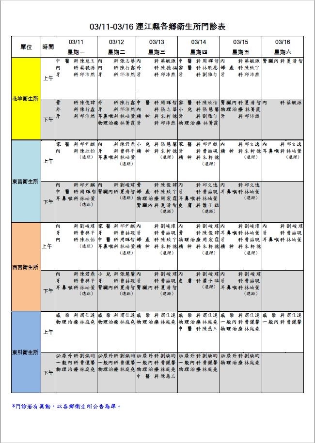 各鄉衛生所門診表【03/14版本更動】