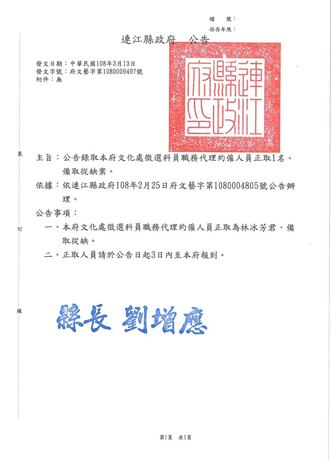 文化處科員職務代理約僱人員錄取公告