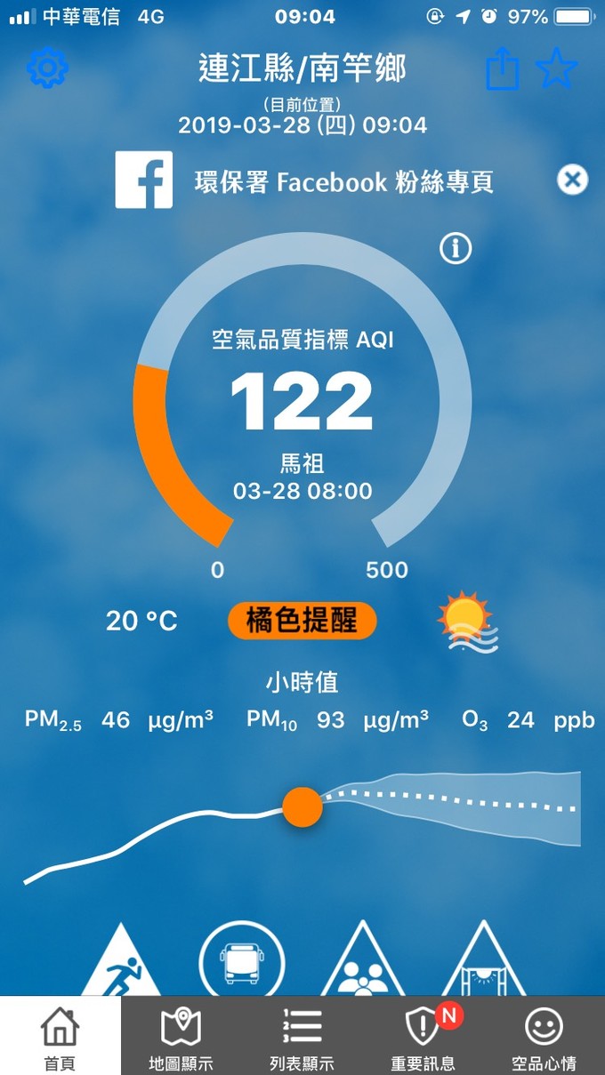 依據環保署今日(3月28日) 上午9時空氣品質監測結果,馬祖地區受境外污染物影響,空氣品質指標AQI為122,對所有族群不健康,環境資源局提醒您