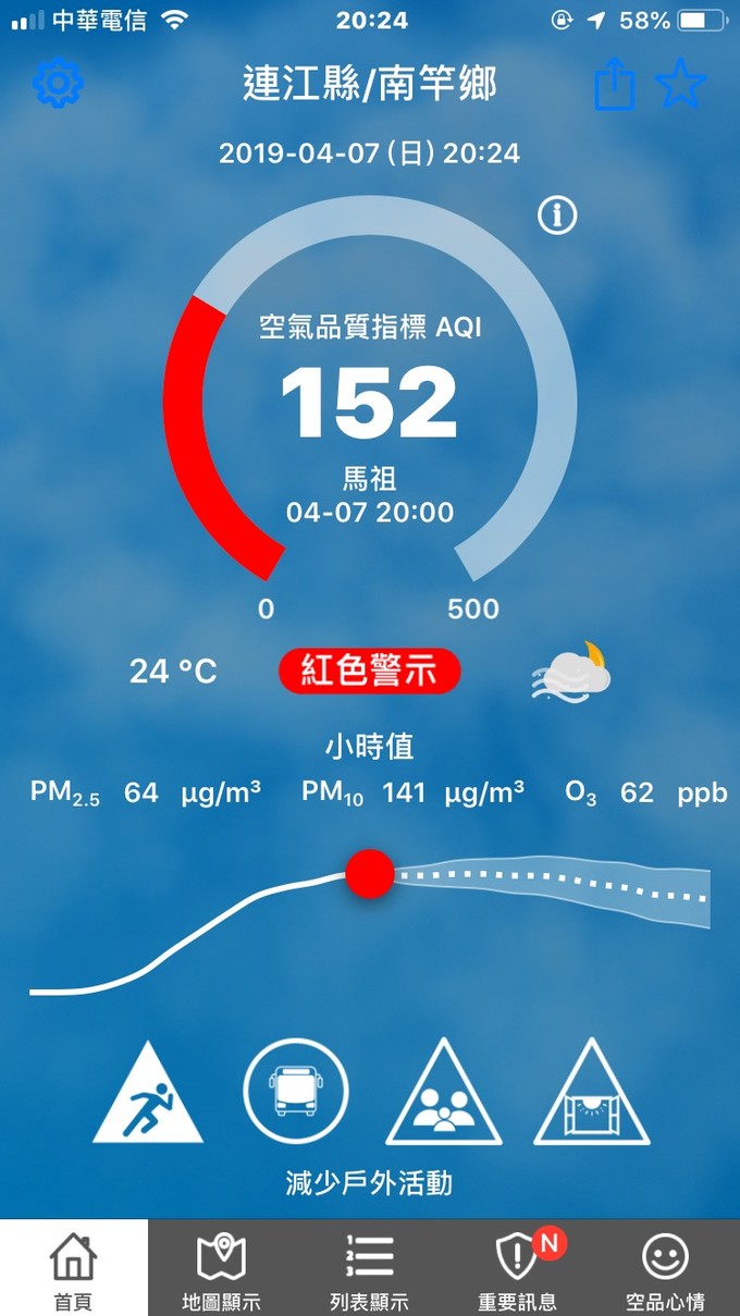 依據環保署今日(4月7日)下午20時空氣品質監測結果,馬祖地區受境外污染物影響,空氣品質指標AQI為152,對所有族群不健康,環境資源局提醒您