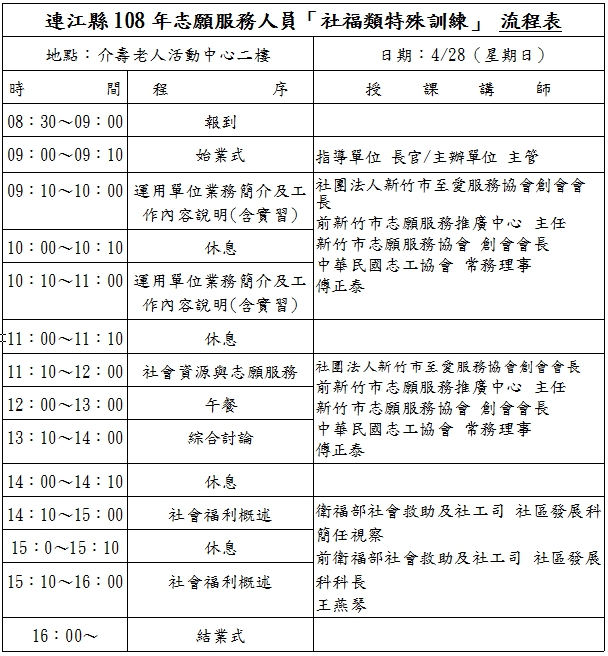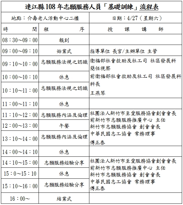 連江縣108年度志工招募及訓練課程 --閱讀人次 : 2268 壹、依據志願服務法規第9條規定,志願服務運用單位應對志工辦理基礎訓練及特殊訓練。辦理基礎、特殊訓練課程係屬運用單位之責任,惟考量各單位陸續有新志工加入,連江縣衛生福利局志願服務推廣中心辦理基礎訓練、社福類志工特殊訓練課程,提供各運用單位推派志工受訓。