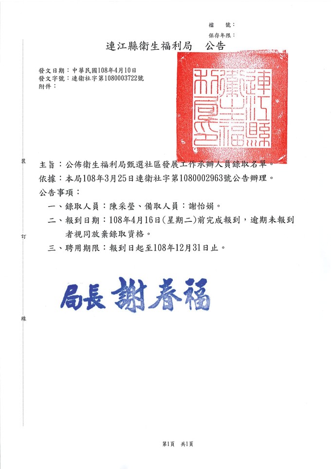 衛福局徵選社區發展工作承辦人錄取公告